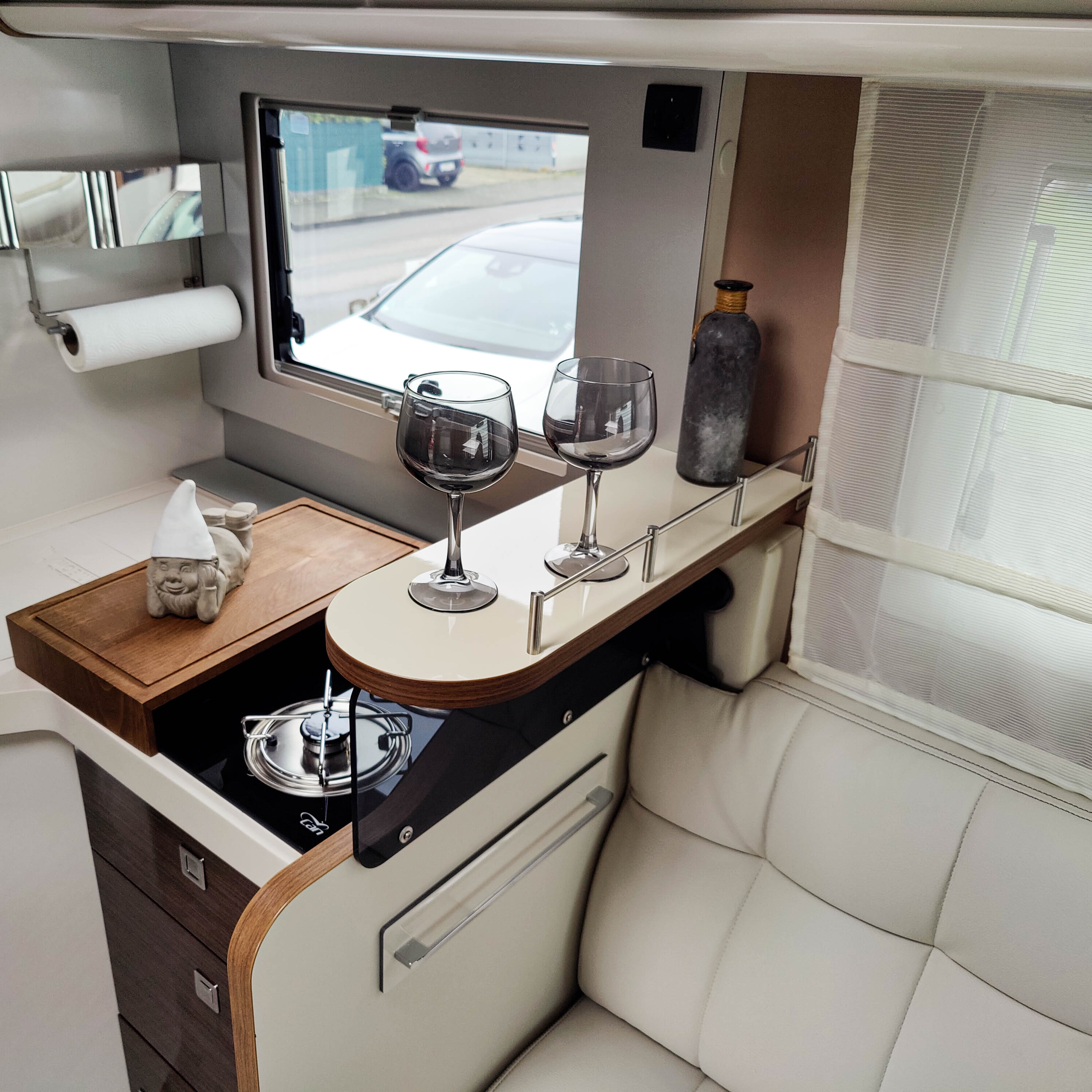 Mobilvetta Krosser and Kea shelf with storage compartment at the kitchen window and face to face
